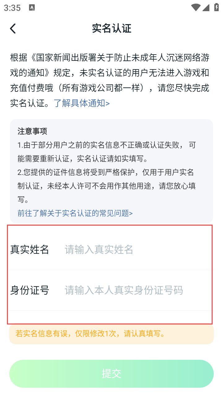 4、在实名认证页面,依次输入真实姓名、身份证号,点击【提交】,完成实名认证。