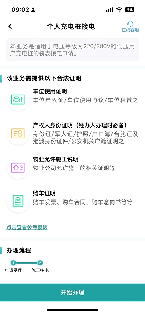 办理此项业务需准备车位使用证明、产权身份证明、物业允许施工说明及购车证明等合法材料。若您已确认上述证明齐全,点击下方“开始办理”按钮即可启动流程。