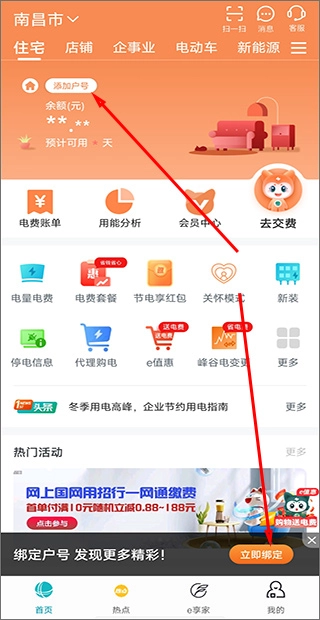 打开网上国网应用后,在首页找到并点击“添加户号”或者“立即绑定”按钮。