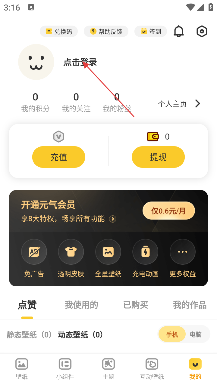 2、在个人页面,能看到积分、关注等信息,点击【点击登录】进入登录选择界面。