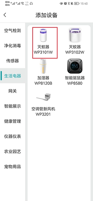 挑选需要添加的设备及其对应的型号,例如灭蚊器 WP3101W;