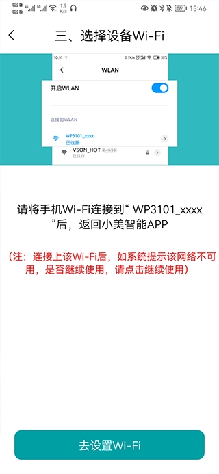 当手机的WiFi连接至wp3101_xxxx后,即可实现与设备的连接。