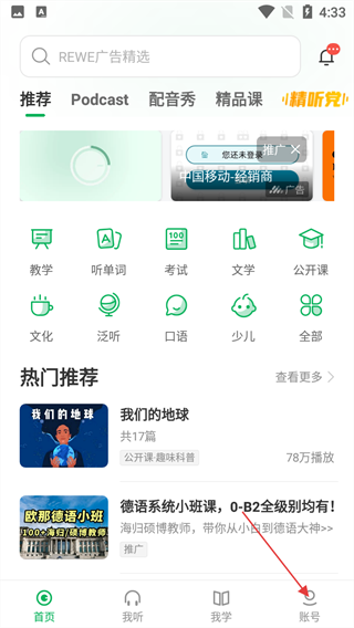 1、在首页点击底部【账号】按钮,可进入个人中心,后续能管理生词本、优惠券等个人学习功能。