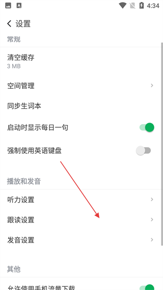 3、在设置页选择【跟读设置】,可对跟读时的显示、Echo回声等功能进行配置,适配个人口语练习习惯。