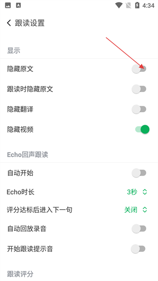 4、在跟读设置页可开启【隐藏原文】等开关,调整Echo时长,优化跟读练习的专注度与体验。