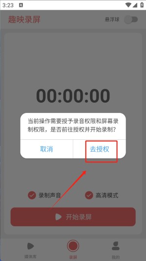 4、最后,如果需要授权录音和屏幕录制权限,点击“去授权”按钮,完成权限设置后即可开始录屏。