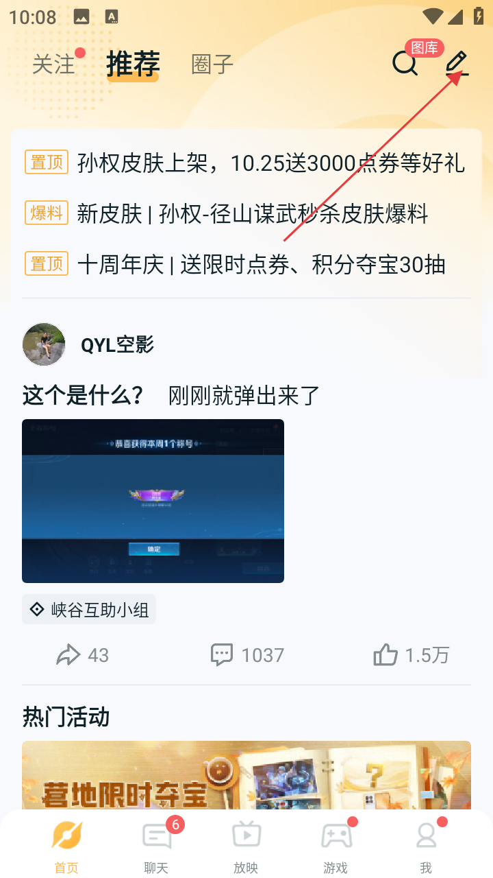 1、在王者营地首页,点击右上角书写图标,展开功能选项,准备进行内容创作操作。