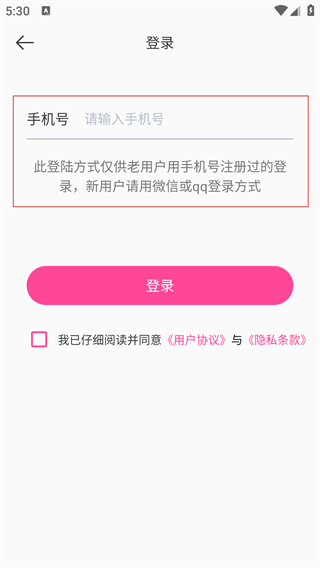 4、在手机号登录界面,输入已注册的手机号,勾选用户协议后点击“登录”,完成账号登录。