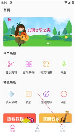 1、在【音乐剪辑精灵】首页,点击底部“设置”选项,进入设置界面。