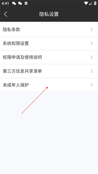 4、在隐私设置界面,点击【未成年人保护】选项,即可查看或配置该App针对未成年人的信息保护相关内容。