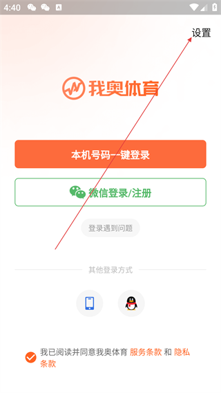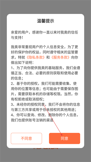 1、打开我奥体育App,阅读《隐私条款》《服务条款》后,点击【同意】按钮进入登录界面。