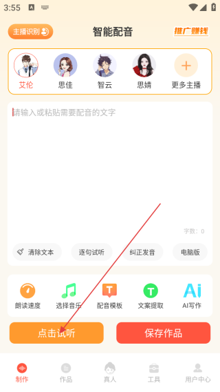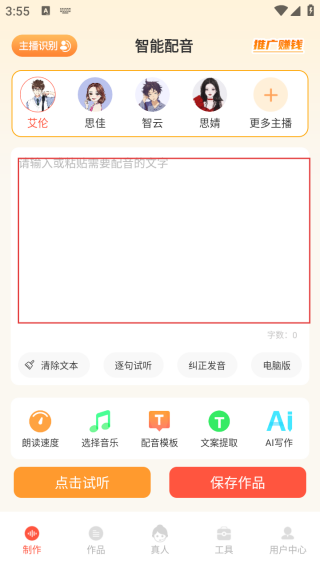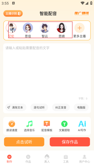1、丰富声音矩阵:汇聚近三百位AI合成配音主播,覆盖多种说话风格,精准适配广告促销、影视配音等多元场景需求。