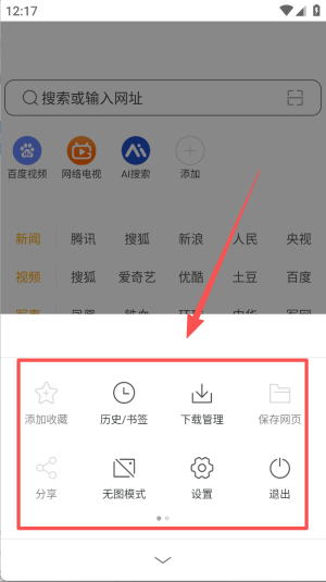1、首页搜索框输入关键词,即可秒开百度视频、新浪等热门站点。