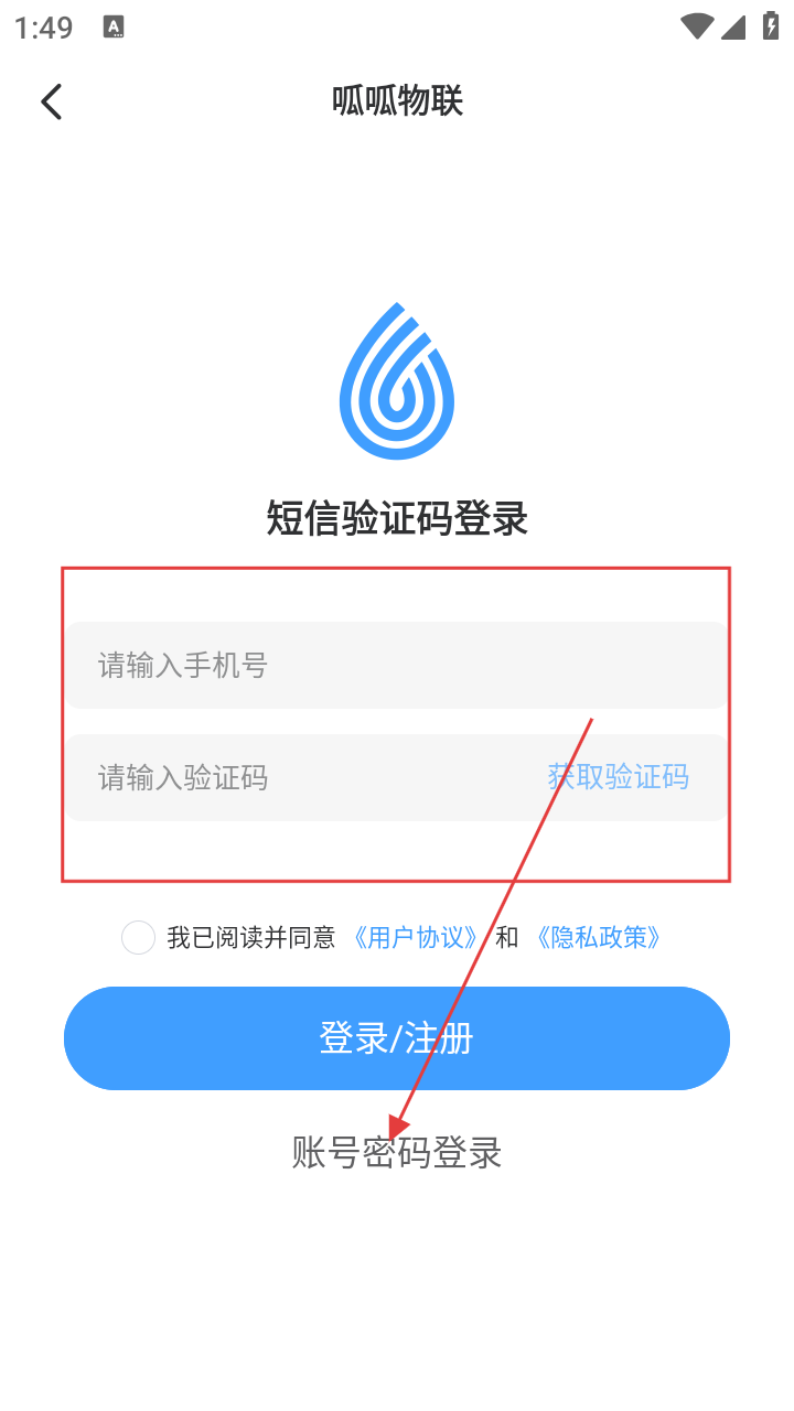 3、跳转至登录界面,点击底部的账号密码登录,进入账号密码登录页。