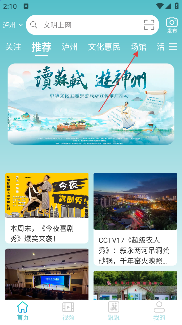 1、打开一泸有你APP,进入首页后,点击顶部导航栏的【场馆】选项,进入场馆页面。