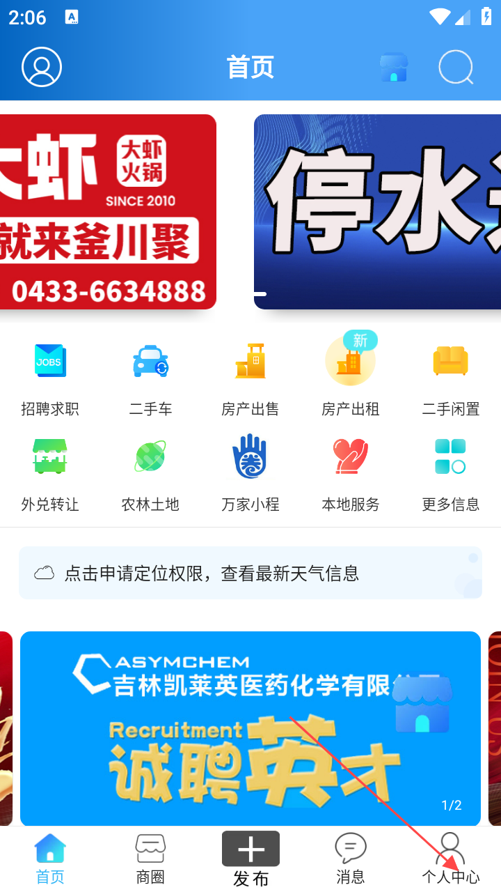 1、打开敦化万家,首页点【个人中心】,进入个人中心页面。