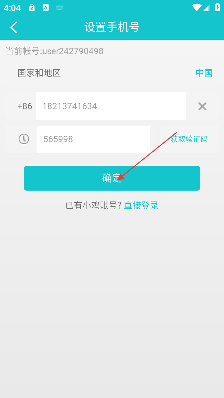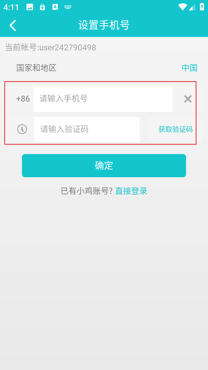 4、在设置手机号界面,输入手机号和验证码后,点击【确定】可完成手机号设置,或选择直接登录已有账号。