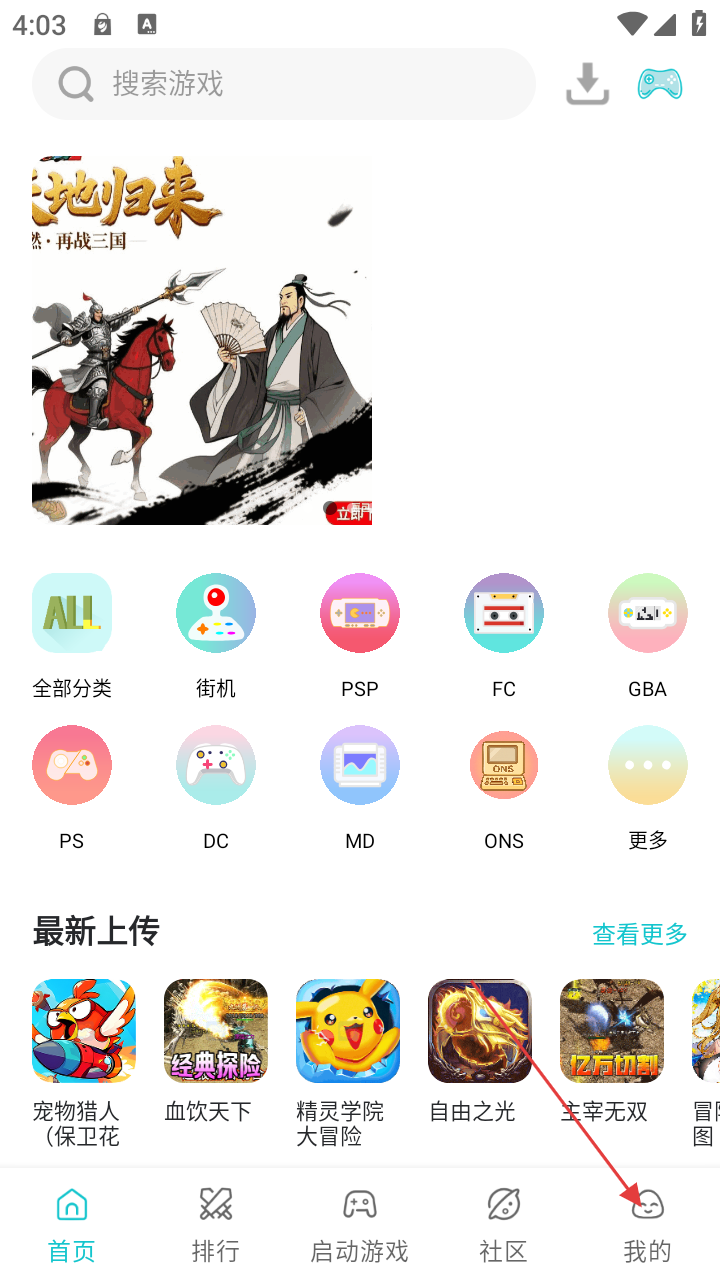 1、在游戏平台首页,可浏览全部分类如【街机】【PSP】等游戏,查看最新上传游戏,点击【我的】进入个人页面。