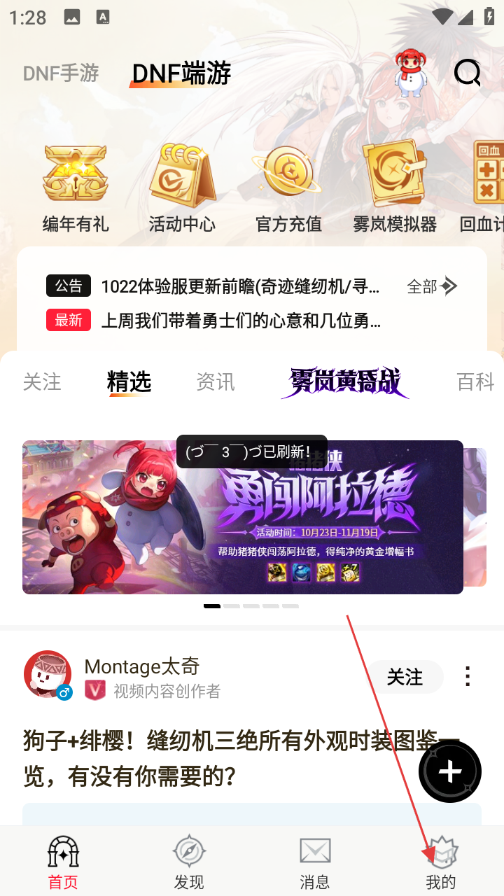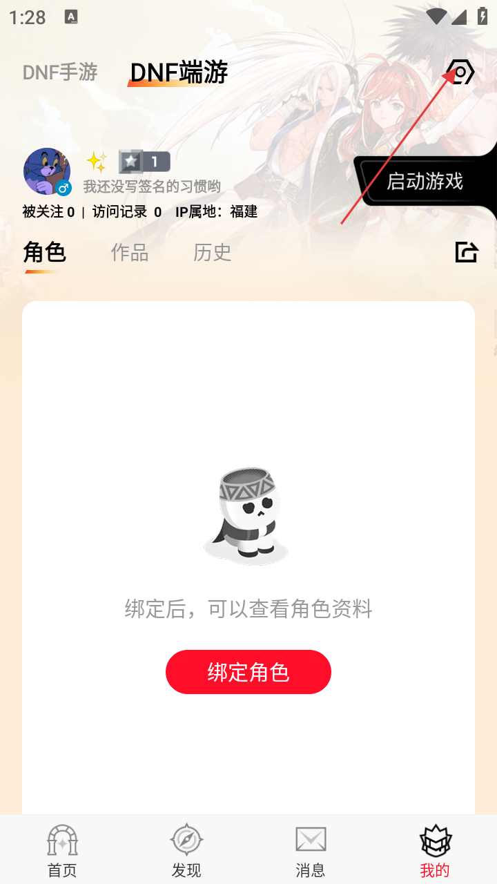 1、在DNF助手首页,点击底部【我的】选项,进入个人中心页面。