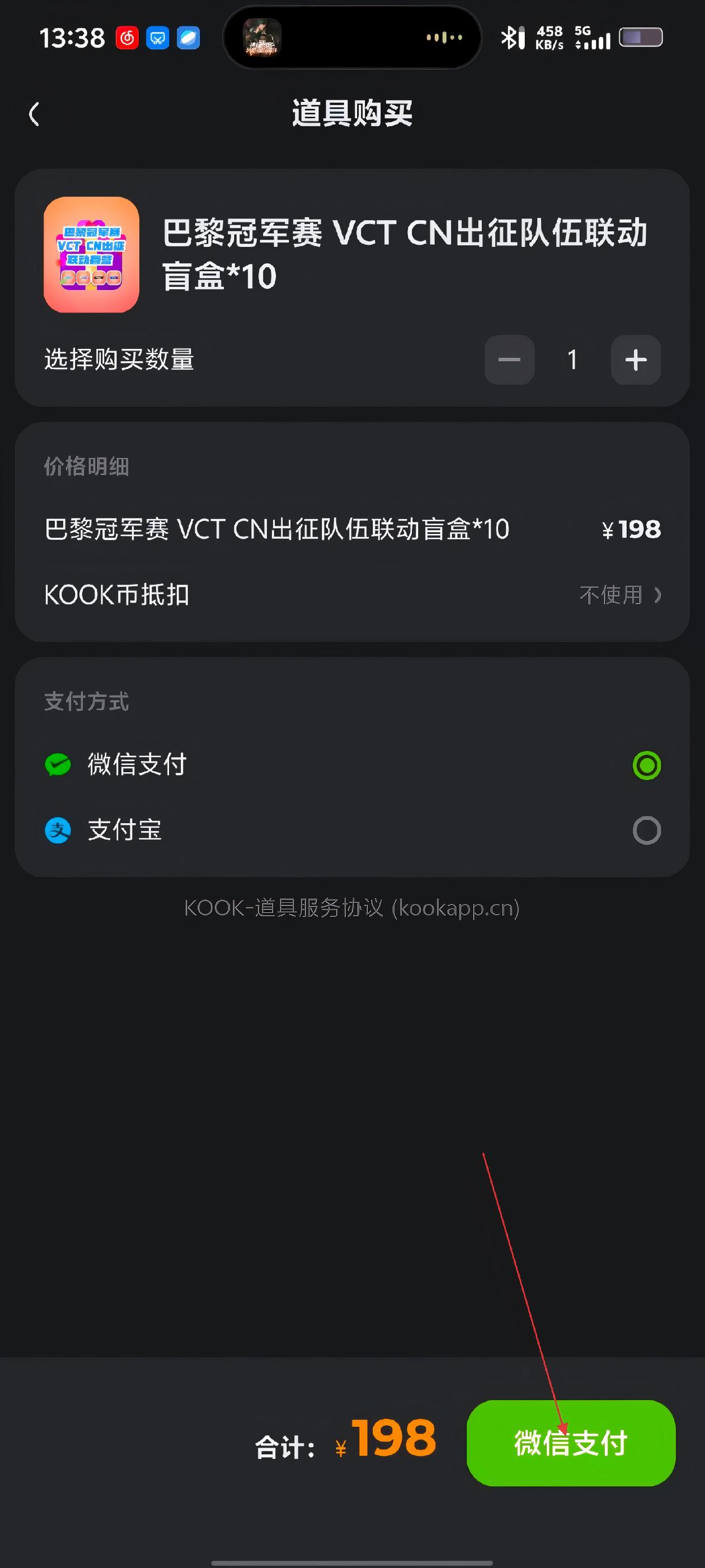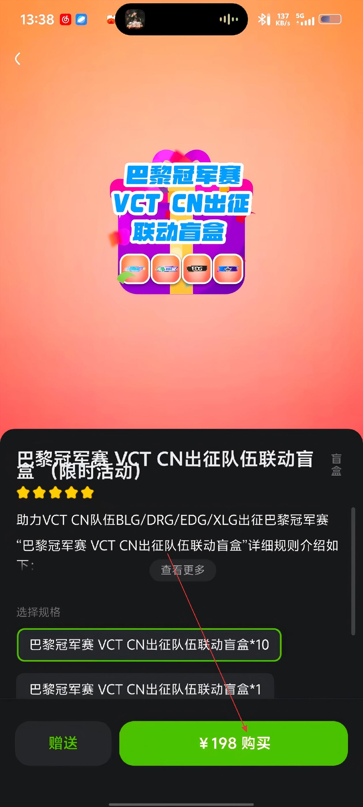 3、在盲盒详情页,选择购买规格,如“巴黎冠军赛VCTCN出征队伍联动盲盒*10”,然后点击【¥198购买】。
