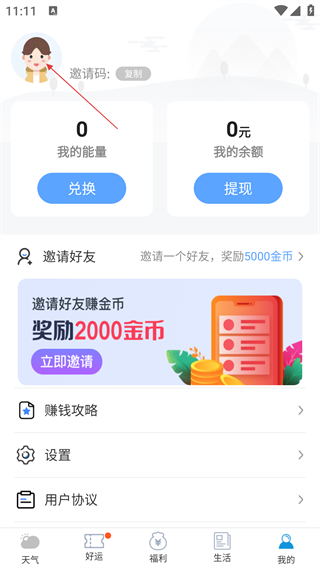 4、登录后可使用“邀请好友赚金币”“我的能量兑换”等功能,未登录则可继续查看天气信息。