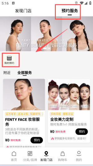 2、切换到发现门店的预约服务页面,顶部有相关选项,下方展示多款美妆服务,包含服务内容和预约按钮,可直接操作。