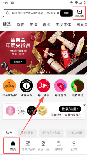 3、回到首页,顶部有搜索栏,下方有精选彩妆等分类标签,还有品牌推广和活动入口,能快速找到心仪的美妆产品。