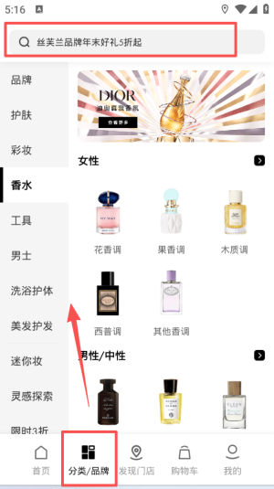 1、点击分类品牌选项,进入对应页面,顶部有搜索栏,左侧是分类栏,右侧分性别展示不同香调的香水,可按需选择。