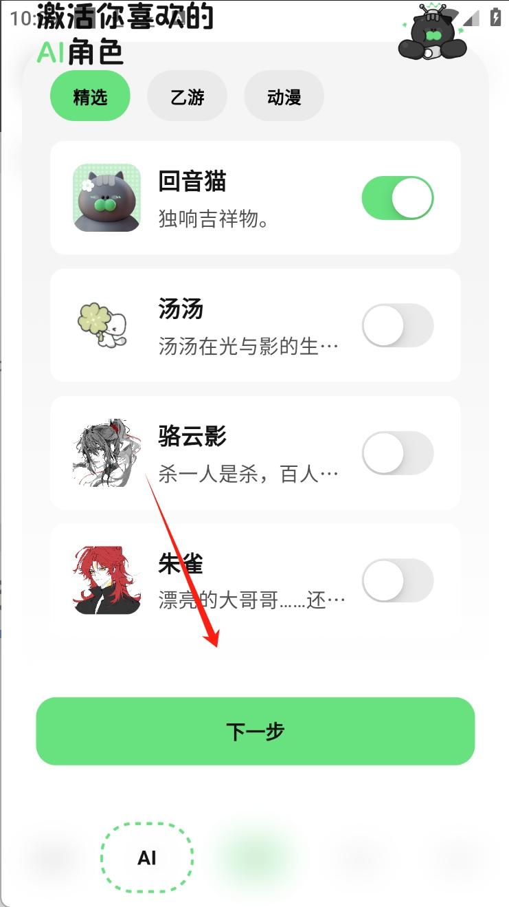 1、选择并激活你喜欢的AI角色,如“朱雀”。