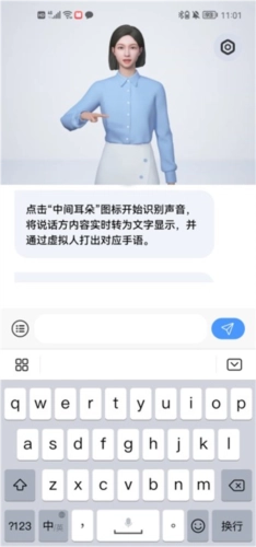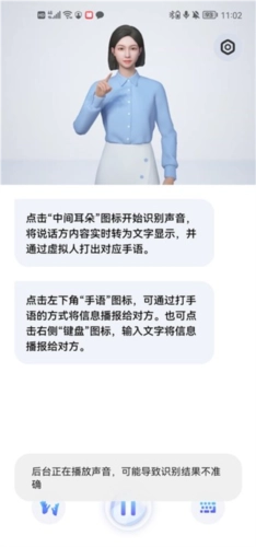点击页面中间的耳朵图标就能启动语音识别功能,当你说出需要翻译的句子后,上方的虚拟人就会用对应的手语将内容呈现出来。