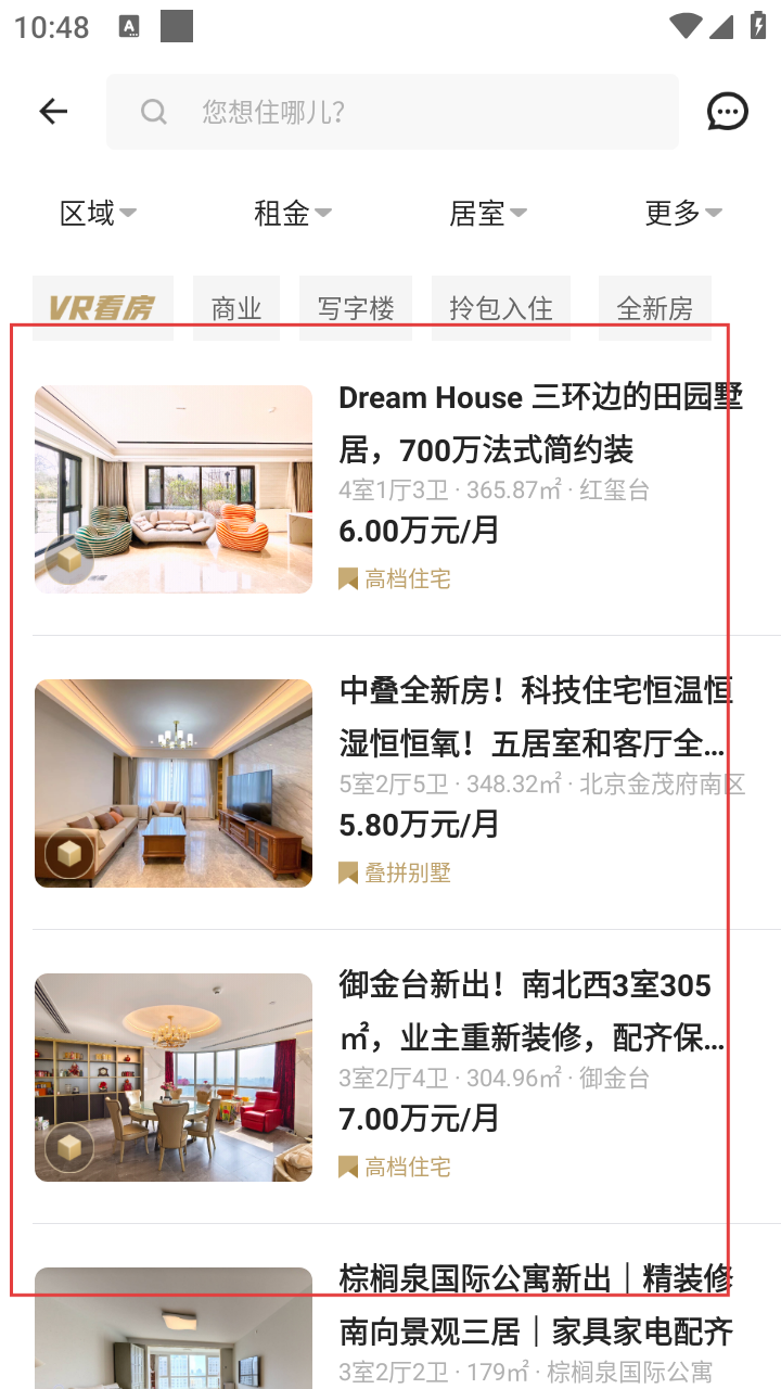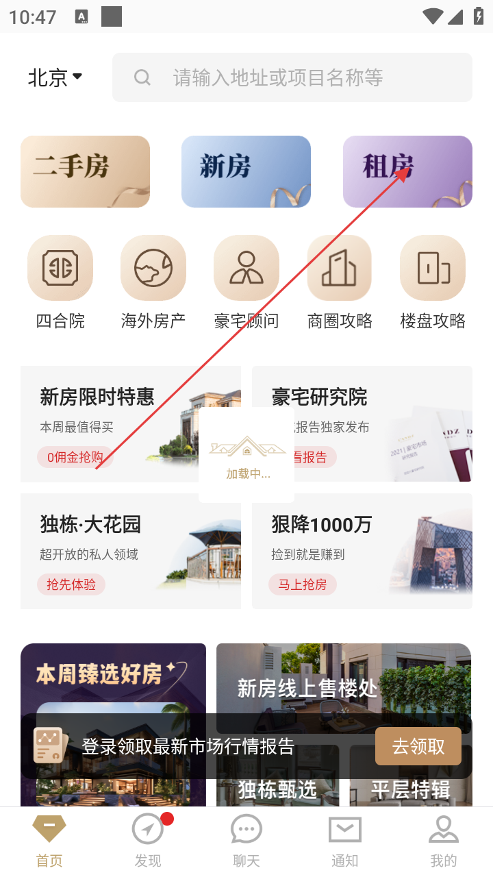 1、打开应用选北京,点【租房】进入租房频道,浏览高端房源。