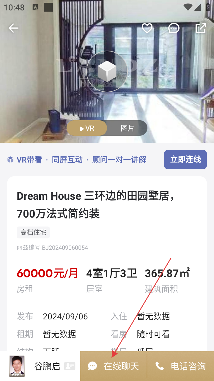 3、房源详情页,若想咨询,点【在线聊天】,按提示登录后和经纪人沟通。
