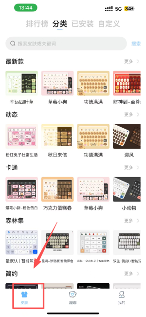 2、进入讯飞输入法的皮肤板块,可查看排行榜、分类等,找到最新款、动态等皮肤分类。