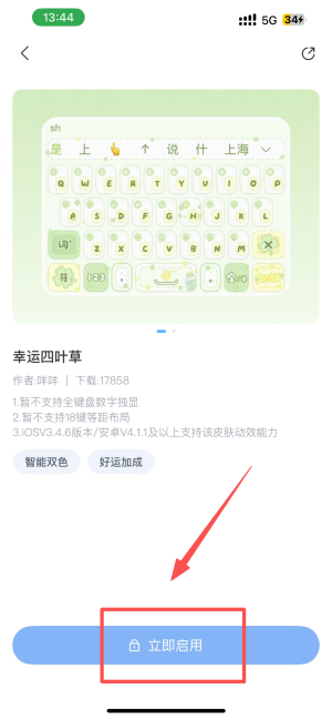 4、选中喜欢的皮肤后,点击立即启用按钮,即可应用该皮肤,体验个性化输入界面。