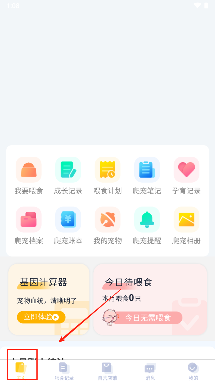 1、点击“主页”按钮,进入应用主界面,查看宠物管理功能。