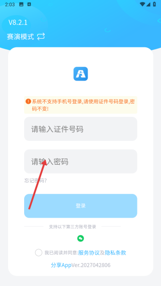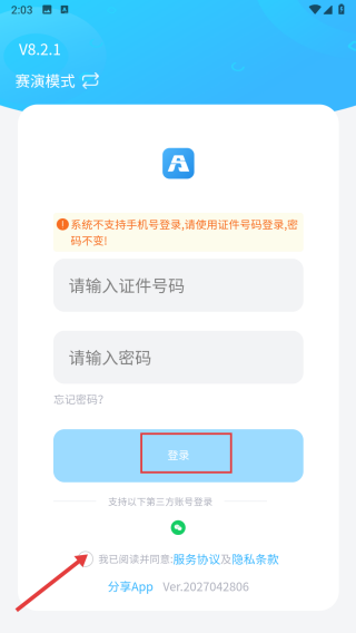 3、勾选协议【我已阅读并同意服务协议及隐私条款】后点击【登录】按钮进行登录。