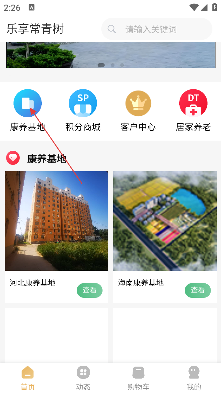 1、打开“乐享常青树”应用,在首页点击【康养基地】选项。