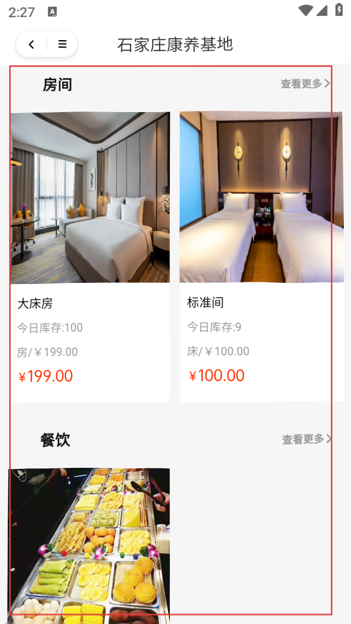 3、在石家庄康养基地详情页,浏览房间和餐饮等相关信息,选择心仪的房型,如大床房。