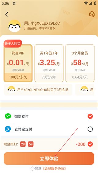 3、在会员开通页可选择【终身VIP】【买1年送1年】等套餐,选好后勾选支付方式,再点击【立即体验】。