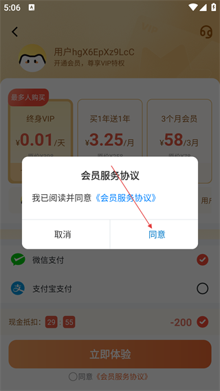 4、点击【立即体验】后会弹出【会员服务协议】弹窗,点击【同意】即可完成会员开通流程。
