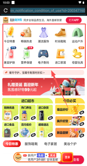 4、登录成功回首页,享特惠选品类直邮全球购。