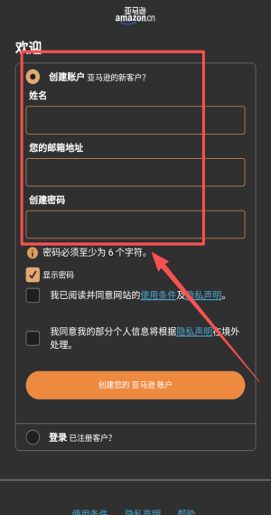 2、填姓名邮箱设六位数密码,勾选同意创建账户。