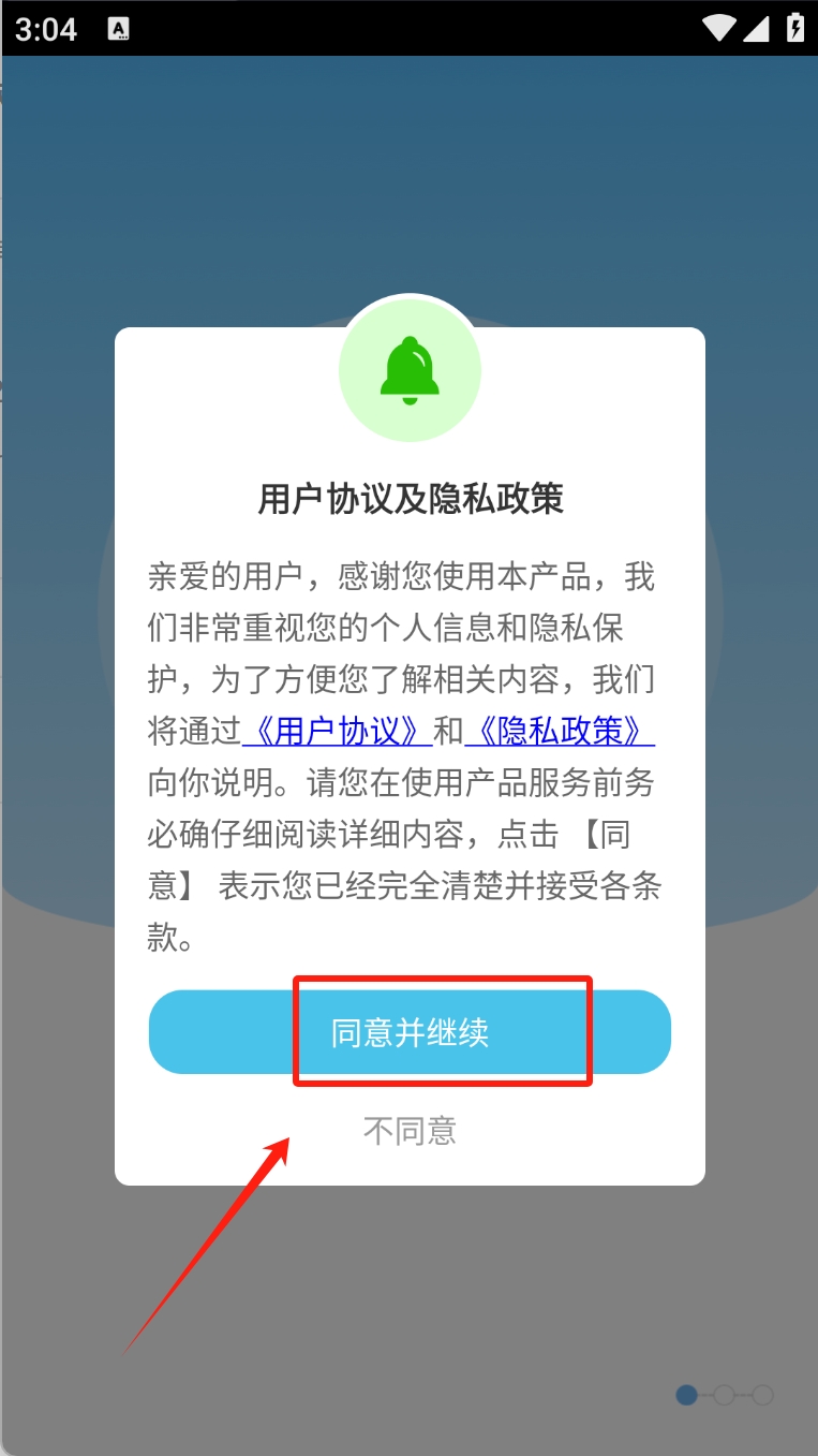 1、首先,点击“同意并继续”按钮以接受用户协议及隐私政策。