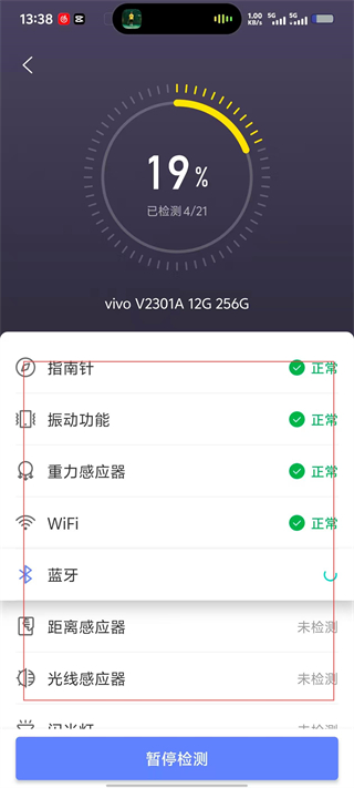3、检测过程中可查看进度,同时能看到已检测项(如指南针、振动功能)的状态是否正常。