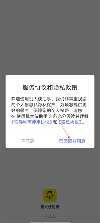 1、使用【机大侠助手】前,需阅读并确认《软件许可使用协议》和《隐私协议》,点击【已阅读并同意】按钮方可进入应用。
