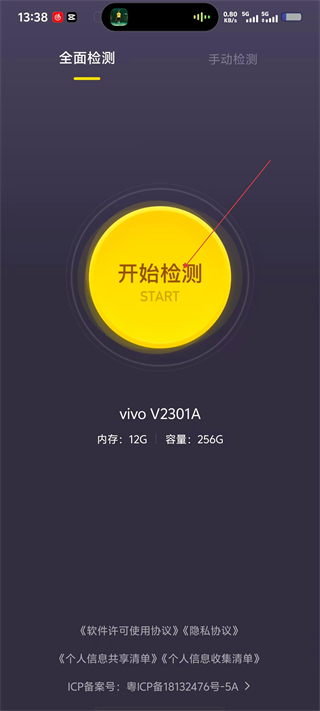 2、进入应用后,在【全面检测】页面点击【开始检测】按钮,即可对设备的各项功能进行检测。