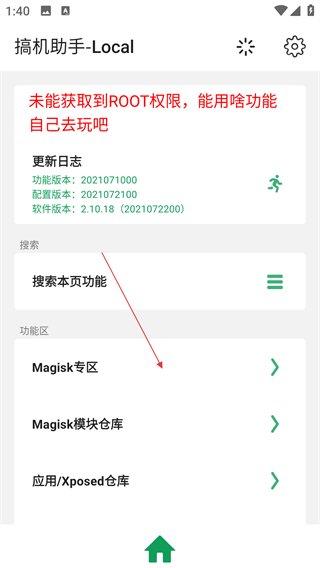 1、在搞机助手主界面,点击【Magisk专区】选项,可进入Magisk相关功能界面,查看模块仓库、管理等功能。