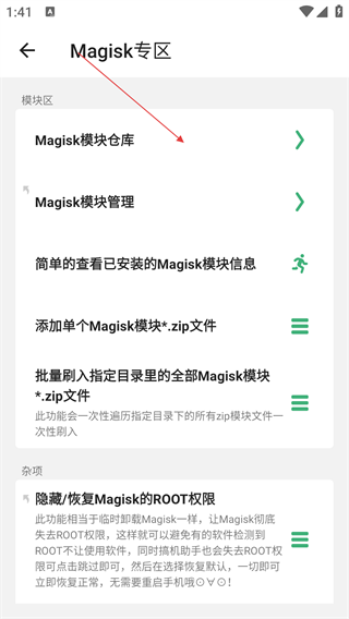 2、进入【Magisk专区】后,点击【Magisk模块仓库】选项,可进入模块仓库界面,查看和管理Magisk模块。