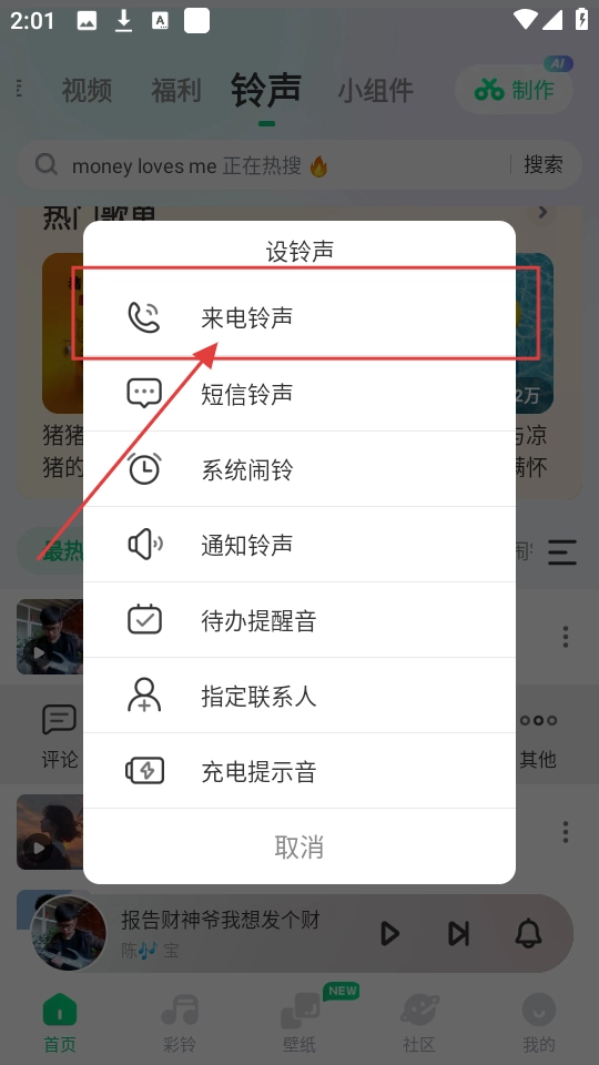 在设置铃声时,可选择来电铃声、短信铃声等不同类型的铃声,选择其中的【来电铃声】选项,将其设置为来电提示音就可以了。