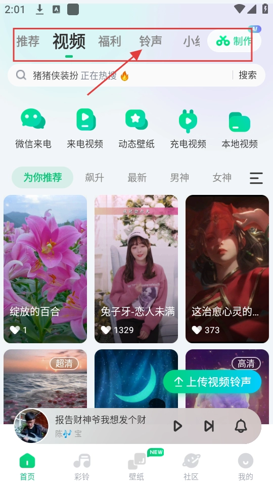 首页设有推荐、视频等分类板块,若您想设置铃声,可点击【铃声】分类,进入铃声页面进行操作。